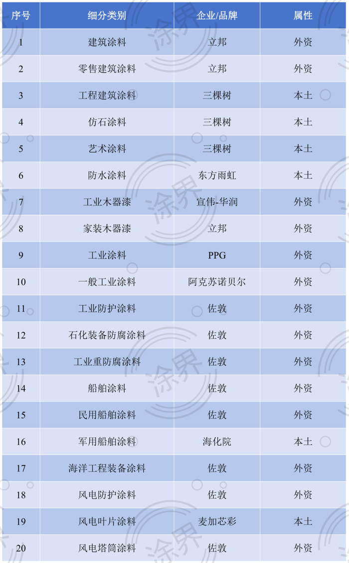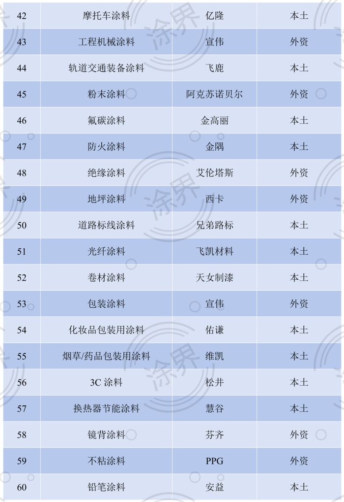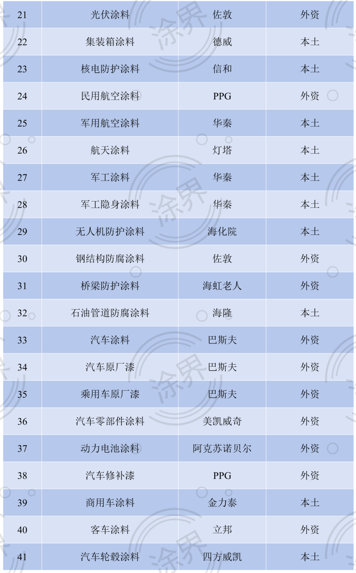 榜单显示,在60个单项中,外资企业占据32在建筑涂料、汽车涂料、船舶涂料工业木器漆(家具漆)、石化装备防腐涂料、工业重防腐涂料、风电防护涂料、光伏涂料、民用航空涂料、海洋工程装备涂料领域占据第一本土企业工程建筑涂料、仿石漆、艺术漆、风电叶片防护涂料、商用车涂料、轨道交通装备涂料、核电防护涂料、集装箱涂料、光纤涂料3C涂料28领域占据第1