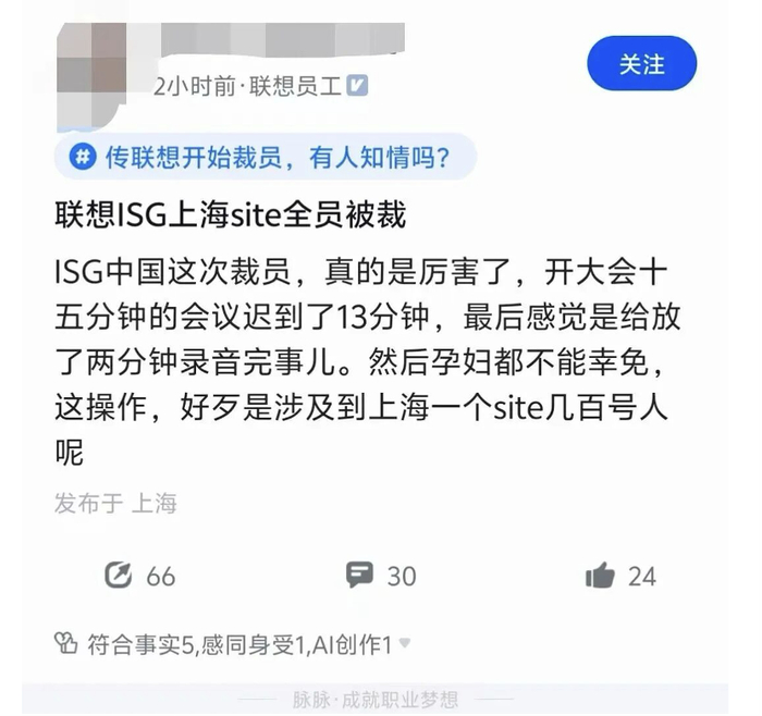 12月1日,一则“联想ISG上海全员被裁”的消息在脉脉、微博等社交平台迅速发酵,数百名认证为联想员工的网友爆料,这场被戏称为“两分钟宣判”的裁员,将联想基础设施方案业务集团(ISG)推上了舆论风口。而此时距离联想集团发布ISG业务“年增63%、创历史新高”的亮眼财报,仅过去半年时间。
