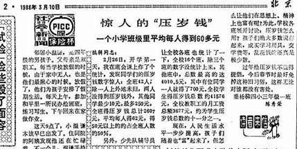 孩子们过年“暴富”,这笔钱怎么花才合适?1988年,垂杨柳四小三年级一班的陈秀荣老师在开学第一天作了统计,发现班里同学的压岁钱数字“惊人”:全班42人平均每人得压岁钱62元。全校16个班,除三个班没统计上来,压岁钱总数约41576元,而全校教职工的月工资总额是3677元,约为学生压岁钱总数的十一分之一。为此,全校专门开展这笔钱怎样使用的主题讨论会,学生们一致表示不乱花钱,积极参加储蓄,支援国家建设。(1988年3月10日《北京晚报》2版《惊人的“压岁钱”》)