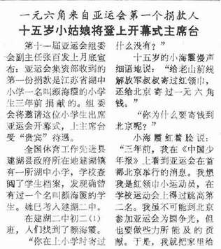 1990年2月底,时任第十一届亚运会组委会副主任张百发宣布:组委会将邀请一位江苏小学生颜海霞出席亚运会开幕式,上主席台受“贵宾”待遇。这是为何呢?原来亚运会集资部收到的第一份捐款就是小海霞三年前捐献的一元六角压岁钱。“我虽不可能到北京参加亚运会为国争光,但也要做些力所能及的贡献……”得知被邀请,已读初二的小海霞激动地说:“我太骄傲了……”(1990年3月6日《北京晚报》4版《十五岁小姑娘将登上开幕式主席台》)