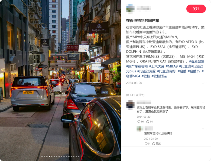 过去常常被嫌弃的内地电动车品牌,现在和老牌传统汽车平起平坐,香港汽车市场正在迅速追上时代。社交媒体里,更有香港人分享自己和家人去试驾国产MPV,直呼综合能力超乎预期:“完全改变了我对国产车的看法。”