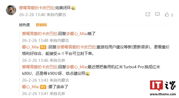 网友正在 REDMI K80 至尊版 (K80 Ultra) 和尚未推出的 K90 至尊版 (K90 Ultra) 之间抉择备用机换机目标。胡馨心表示:“重游戏用户建议等新(更新很多),更看重价格利好综合,能接受 n-1 平台可立刻下单。”