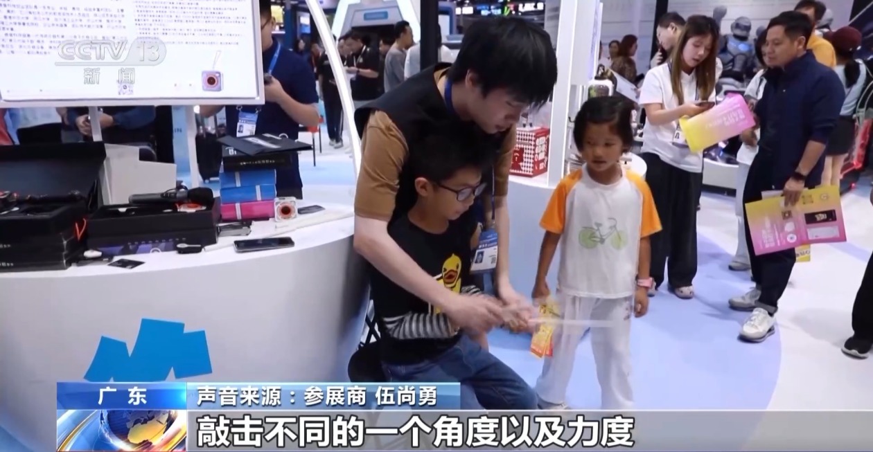 参展商 伍尚勇:“它会把声音传到小音响上面。可以通过敲击不同的角度以及力度,发出不同的声音,跟真实架子鼓声音的相似度达到了95%以上。”