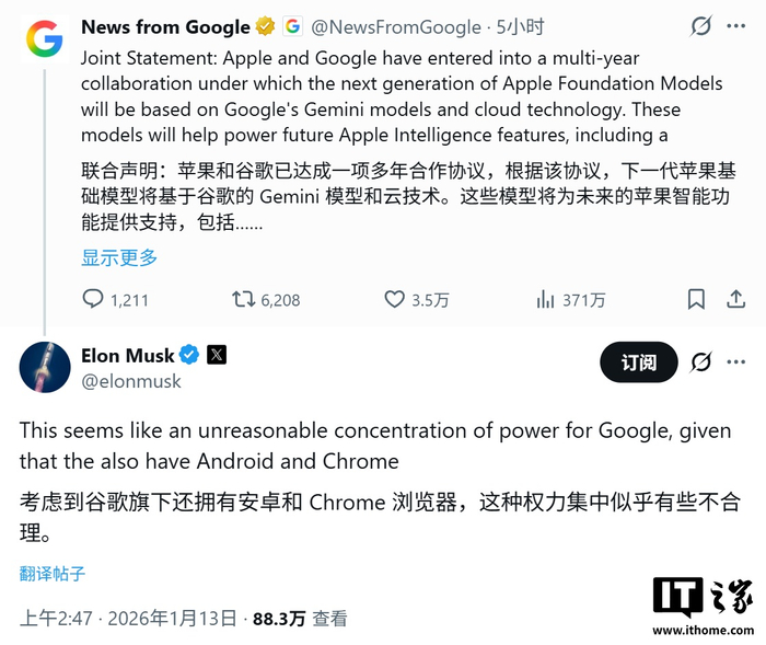 IT之家1月13日消息,埃隆·马斯克(Elon Musk)今天(1月13日)在X平台发布推文,就苹果和谷歌公司合作,在Siri及苹果基础模型中整合Gemini AI模型,抨击认为该合作导致谷歌掌握了“不合理的权力集中”