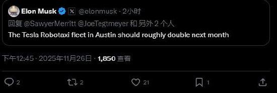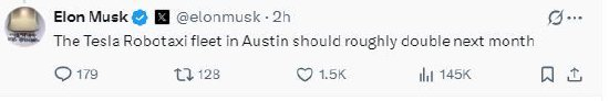 “下个月,奥斯汀的特斯拉机器人出租车数量应该会增加大约一倍,”马斯克在X上的一条帖子中写道。