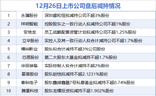 据统计,12月26日,盘后徐工机械披露了增持情况。同时,永臻股份、祥明智能、安培龙、立华股份、博纳影业、芯原股份、华辰装备、霍普股份、春秋电子、腾景科技等10家上市公司披露了拟减持情况。