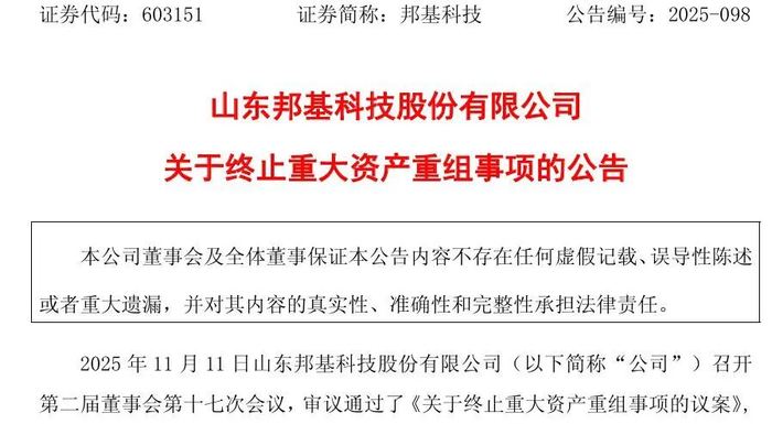 邦基科技公告显示,本次交易尚处于预案阶段。根据相关法律法规要求,终止本次交易事项无需提交公司股东会审议。公司第二届董事会独立董事也就此事召开了2025年第三次专门会议,对终止事项表示认可,并认为该决定“不存在损害公司和全体股东利益的情形”。