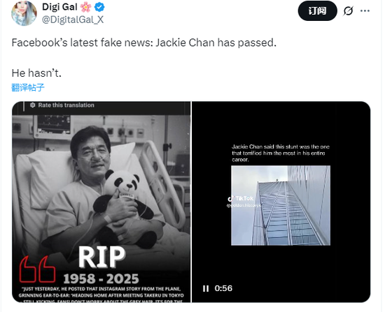 该帖子配以一张人工智能生成的成龙躺在病床上的图片,并附有捏造的日期,暗示他已经去世,帖子迅速走红。
