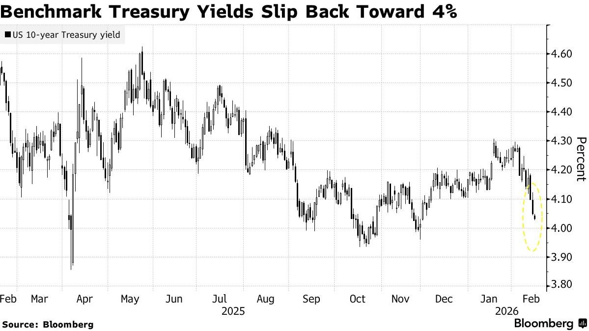 “上周美国CPI数据偏弱,以及股市中持续的量化基金系统性去杠杆,正在推动债券买盘,”新加坡道明证券高级策略师普拉尚特·内纳哈表示。“从技术面看,美国10年期国债收益率4%水平正成为成败关键位。若该水平被跌破,预计收益率将大幅下挫。”