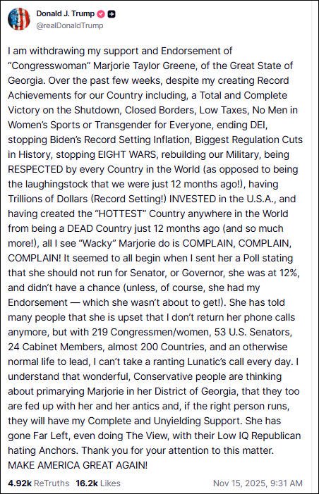 “我正撤回对众议员玛乔丽·泰勒·格林的支持和背书。”特朗普写道,他补充说格林正在竞选2026年连任,但她已经“走向极左”。